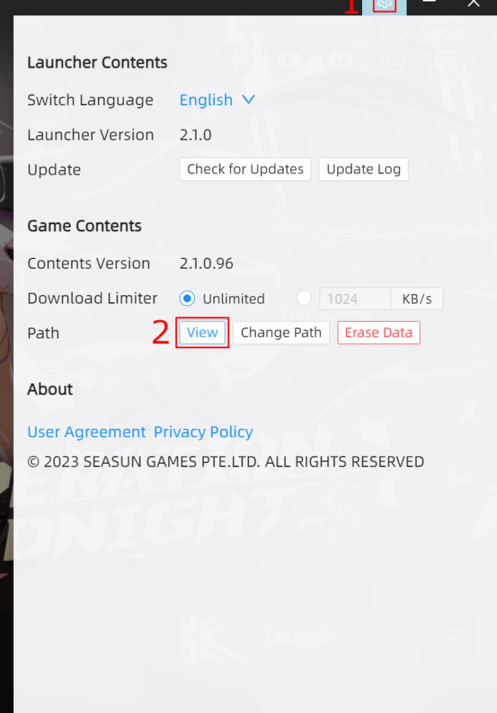 First, boot up the game's launcher and click the settings icon on the top right (1). Then under "Game Contents," click the "View" button to open up the game's install folder (2).